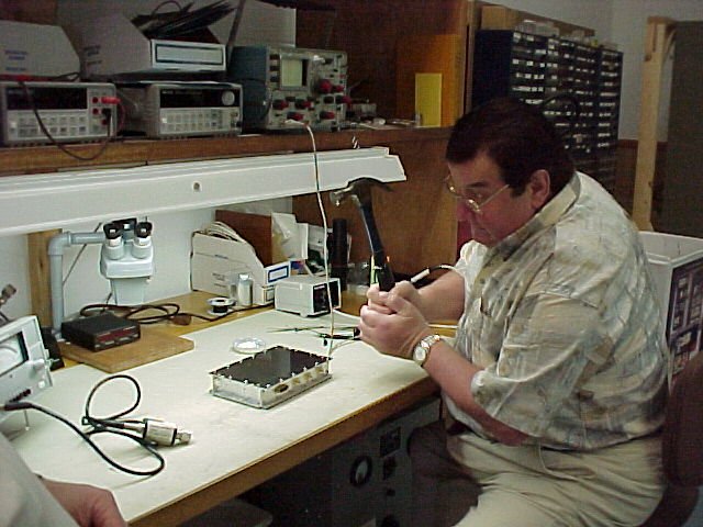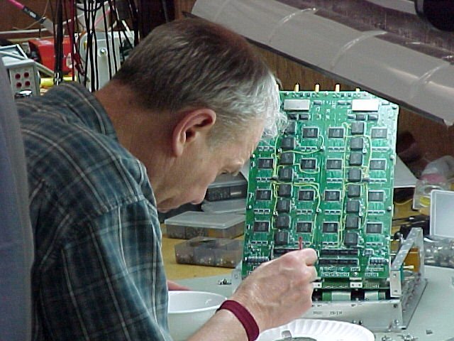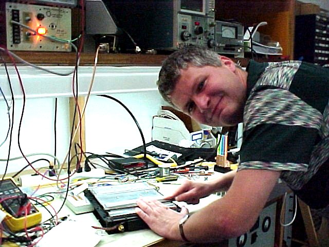 - Werner does some fine tuning on his U-band TX ( Yes - that IS a hammer... ) (69k)