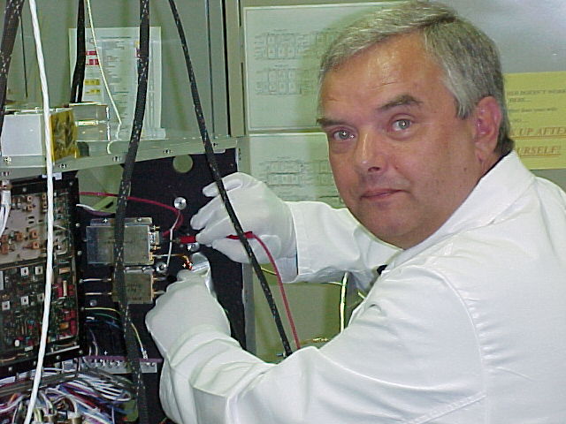 - Stan is on the roof here, installing the temporary GPS antenna for testing the spacecraft receivers (41k)
